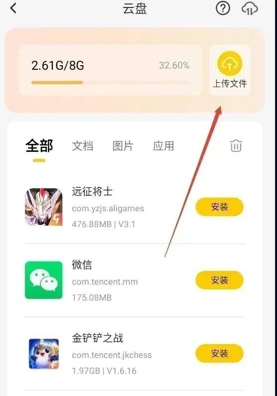 ⑤.点击上传文件进去,再点击上传,会出现本机的一些应用,下面的全部就是从本机上传成功的