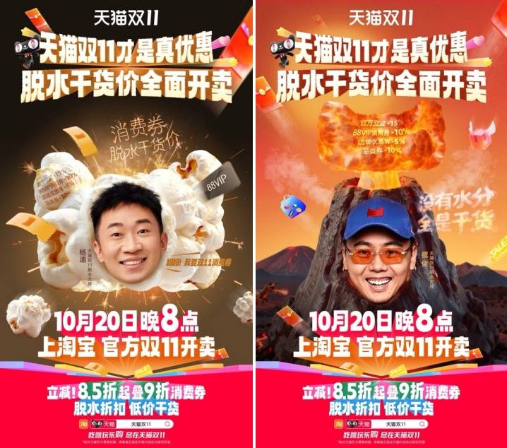 在短视频之外,配套平面创意进一步强化视觉认知。达人化身火山、海绵、干燥剂等“脱水神器”,以符号化视觉语言加深用户对“脱水价”的理解。通过“短视频+平面”双维度内容布局,“天猫双11脱水价”在快手平台实现广泛传播。