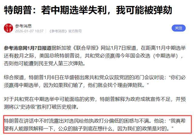 这位一向自信爆棚、仿佛永远都在赢的总统,罕见地流露出了焦虑。他竟然当着党内同僚的面承认,如果我们输掉今年的中期选举,一定会找理由弹劾我!这是特朗普自去年重新掌权以来,破天荒第一次把“弹劾”这两个字挂在嘴边。