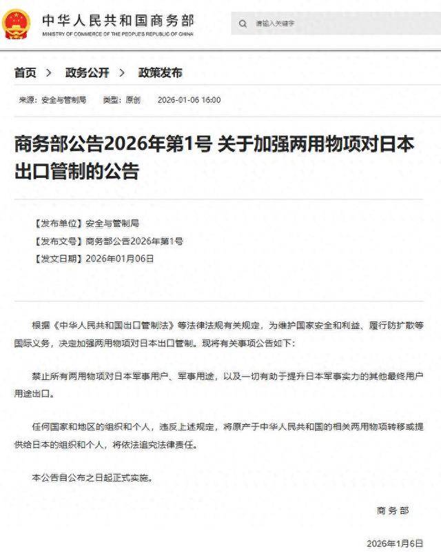 2026年的1月6日,对于中国商务部来说,是发布年度1号公告的日子。而对于某些长期沉浸在政治迷梦中的日本政客而言,这一天无异于惊雷落地。