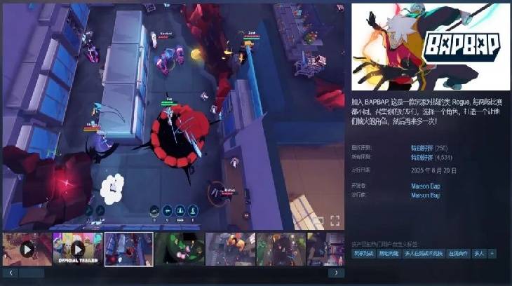 在《YAPYAP》之前,他们最出圈的产品是《BAPBAP》。那是一款主打多人大乱斗的Roguelike派对游戏,支持最多8人同局。同样是极简的画风,同样是强调随机性和互坑,《BAPBAP》就已经确立了该团队的设计DNA——人多、随机、混乱。
