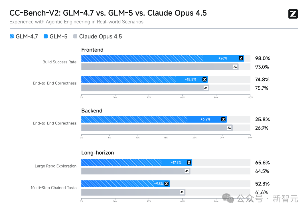 在开发者最关心的内部Claude Code评估集合中,GLM-5在前端、后端、长程任务等编程开发任务上显著超越上一代的GLM-4.7(平均增幅超过20%)。
