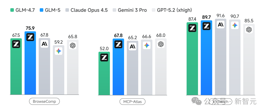 BrowseComp(联网检索)、MCP-Atlas(工具调用)和τ²-Bench(复杂规划),全线霸榜开源第一。