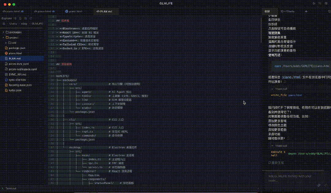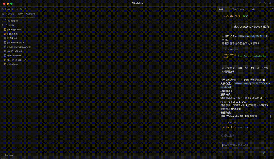 在Z Code里,你只管提需求,模型会自动拆解任务,甚至拉起一堆Agent并发干活:写代码、跑命令、Debug、预览,最后连Git提交都帮你搞定。