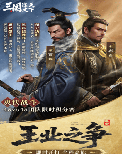 王业之争主打快节奏的多线动态对抗与配队博弈:它采用积分决胜机制,个人与阵营积分相辅相成,不管是前线冲锋杀敌,还是后方开垦支援,都能积累积分,玩家可自由选择战场定位,多劳多得;平均不到一小时的对局时长,让玩家无需漫长等待,随时能开启新一轮对战,而且奖励十分丰厚,黄金、名将令、卷轴、装备图纸等应有尽有,助力主公快速成长。